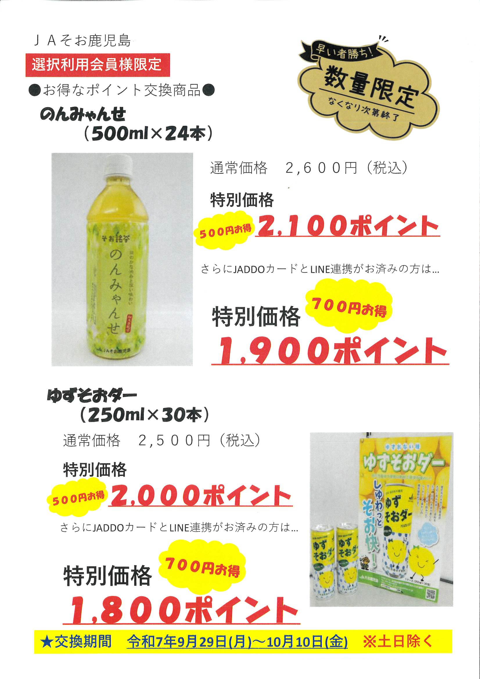 JADDOカードポイント残高2,000ポイント以上の選択利用コース会員様を対象に、貯まったポイントで、「のんみゃんせ」や「ゆずそおダー」を令和7年9月29日(月)~10月10日(金)の期間内に限り、各購買店舗にて特別価格で購入できます!