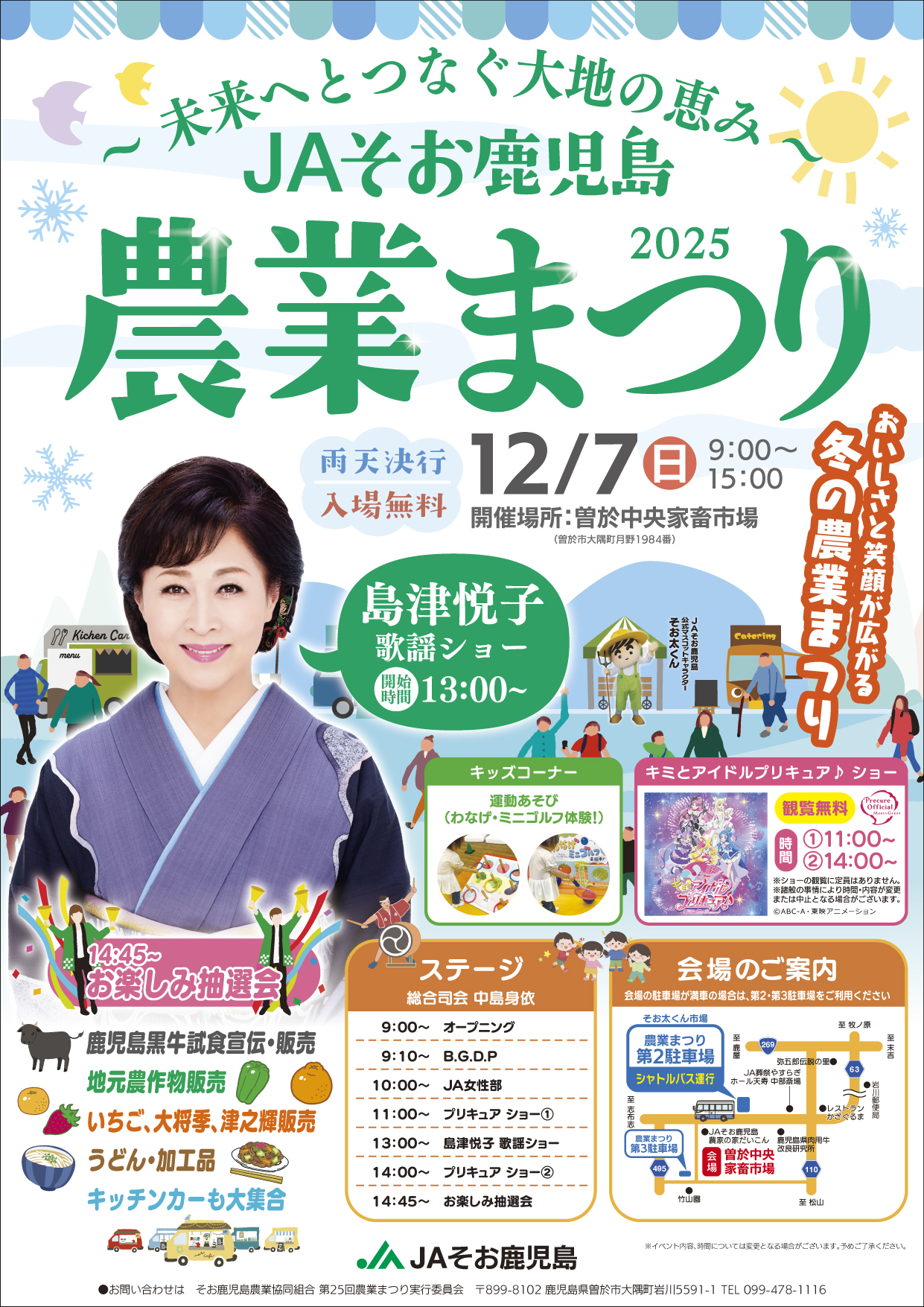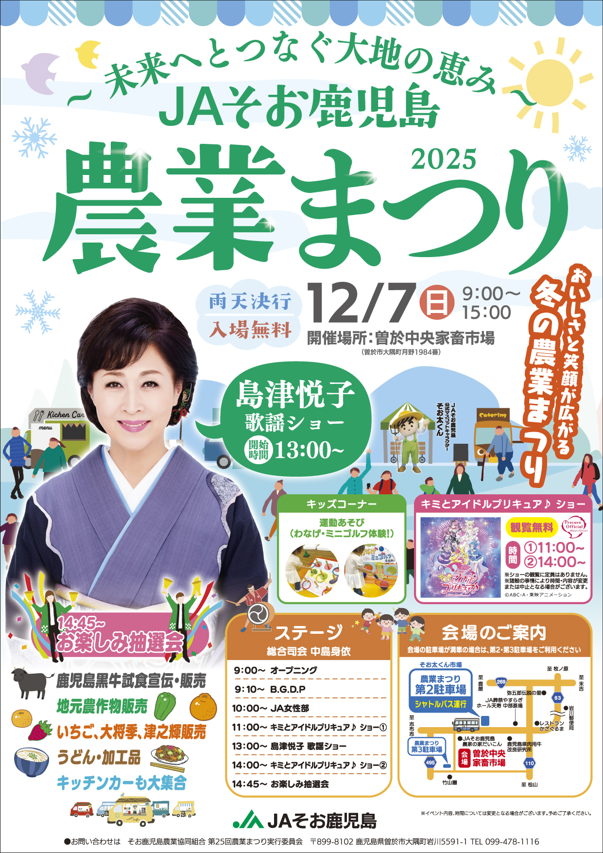 農業まつり2025の開催について2025.11.0512月7日(日)に曽於中央家畜市場で「農業まつり2025」を開催します! 皆様に楽しんでいただけるよう、様々なステージイベントやマルシェでおもてなしいたします。 詳しい内容は以下のチラシをご覧ください。 また、イベント内容、時間については変更となる場合がございますので、ご了承ください。 皆様のご来場を心よりお待ちしております!
