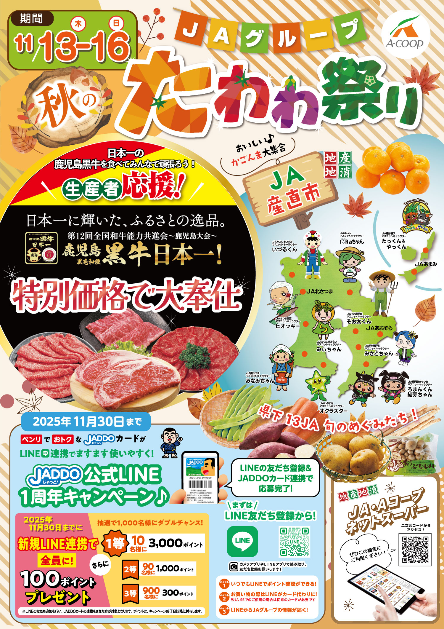 JAグループ 秋のたわわ祭りのお知らせ2025.11.11●JAグループでは、秋のたわわ祭りを開催します! 開催期間:令和7年11月13日(木)~16日(日)まで 県下13JAの自慢の逸品をお試しあれ! ※詳しくは、チラシをご覧下さい。 また、AコープとMBCラジオとの共同でプレゼント企画も実施します! JAそお鹿児島を含む県下JAの特産品が抽選で当たります! 応募締切:11月16日(日)まで ※詳しくは、チラシをご覧下さい。